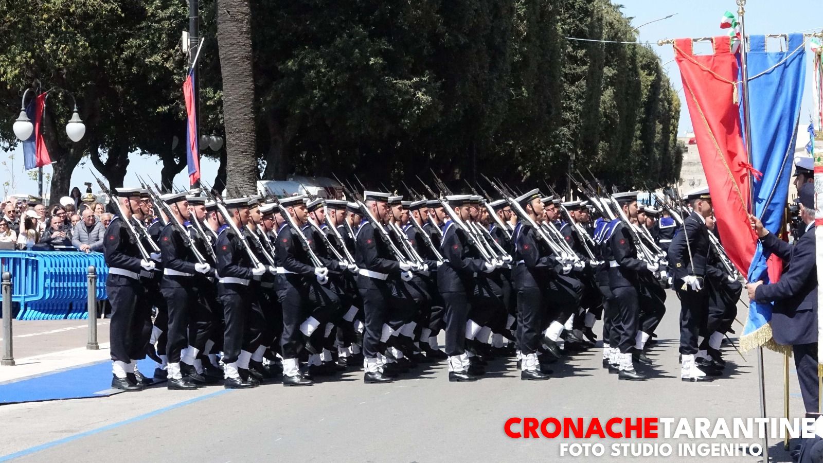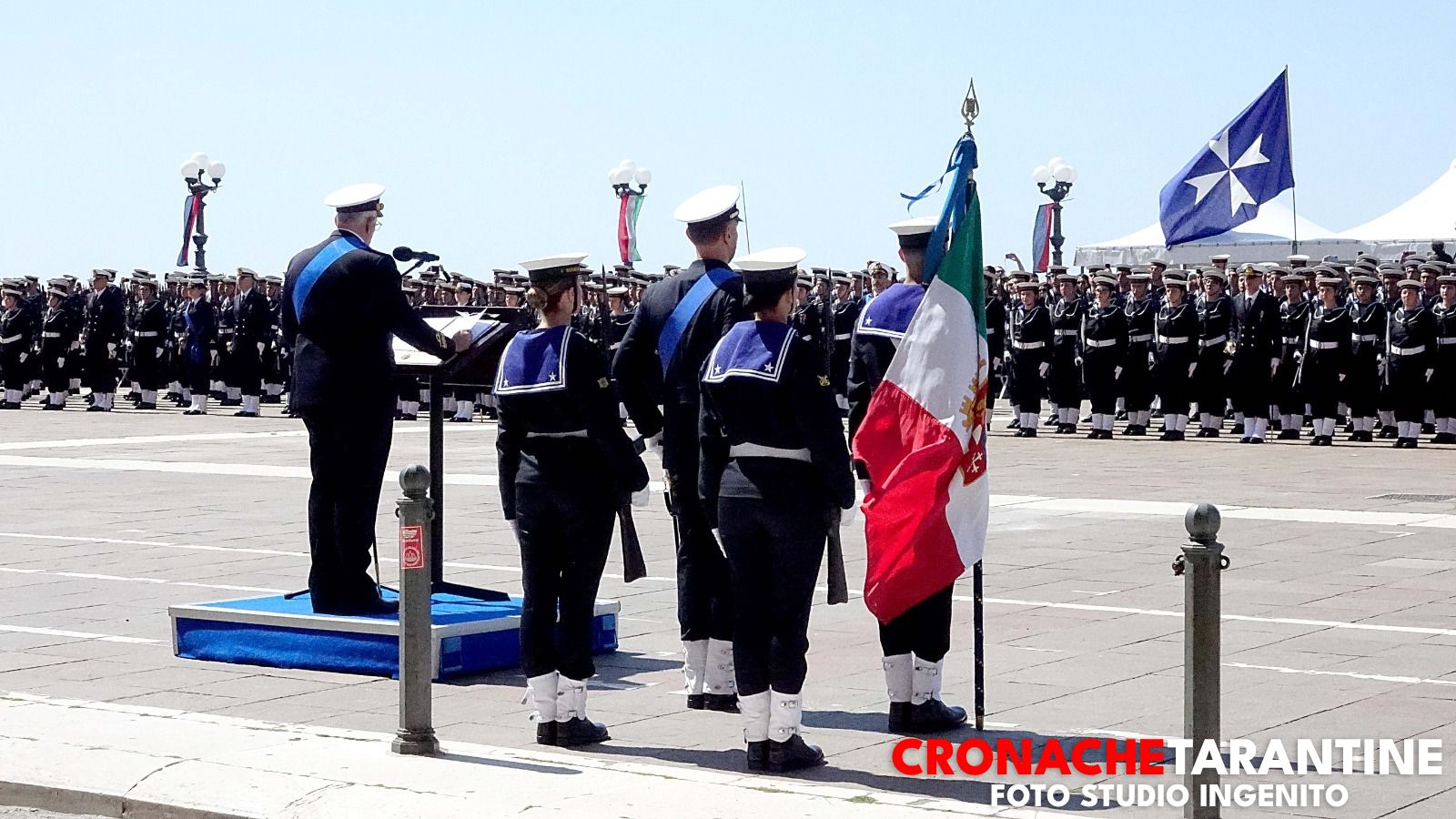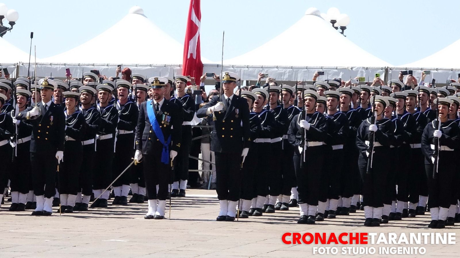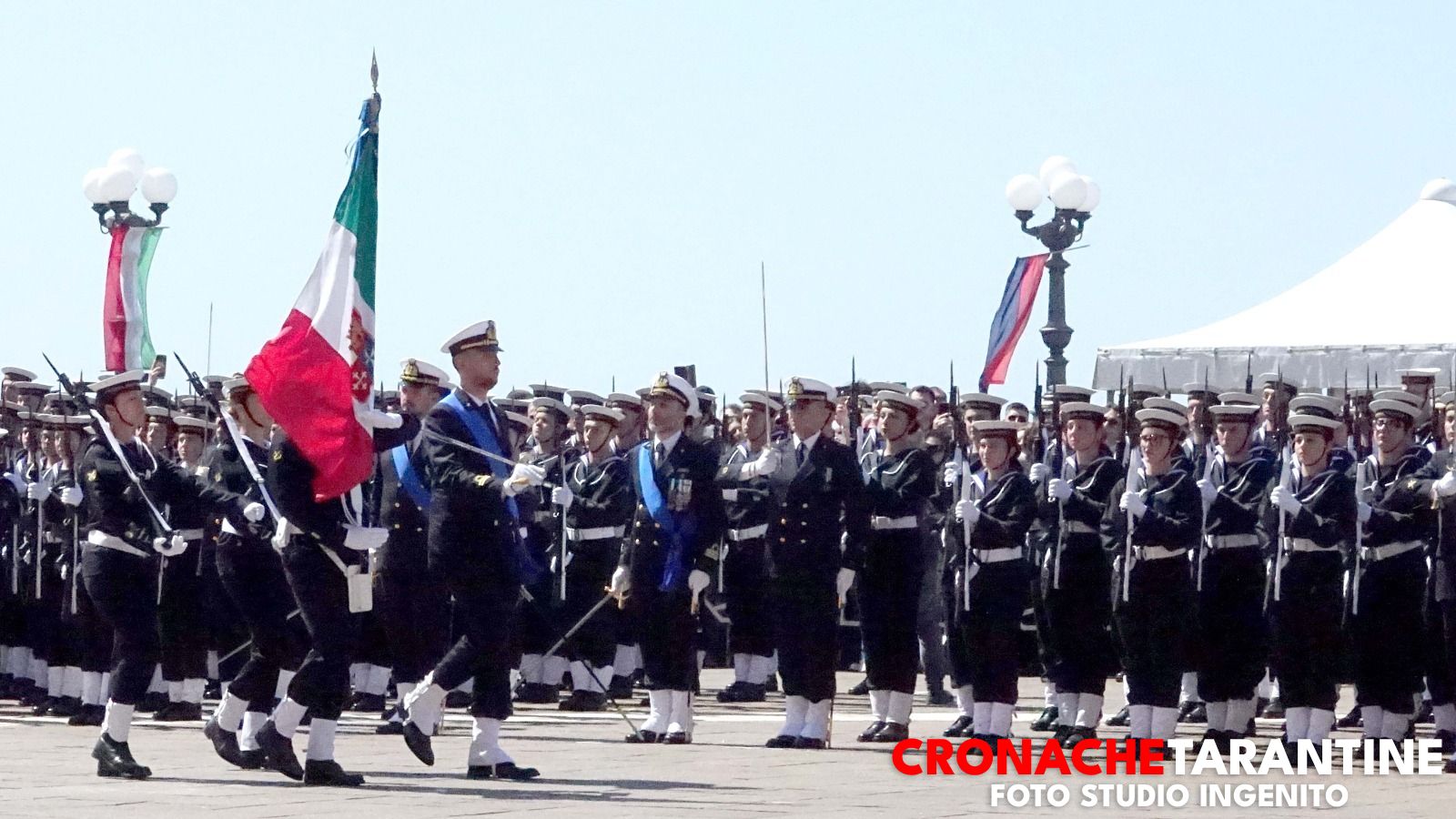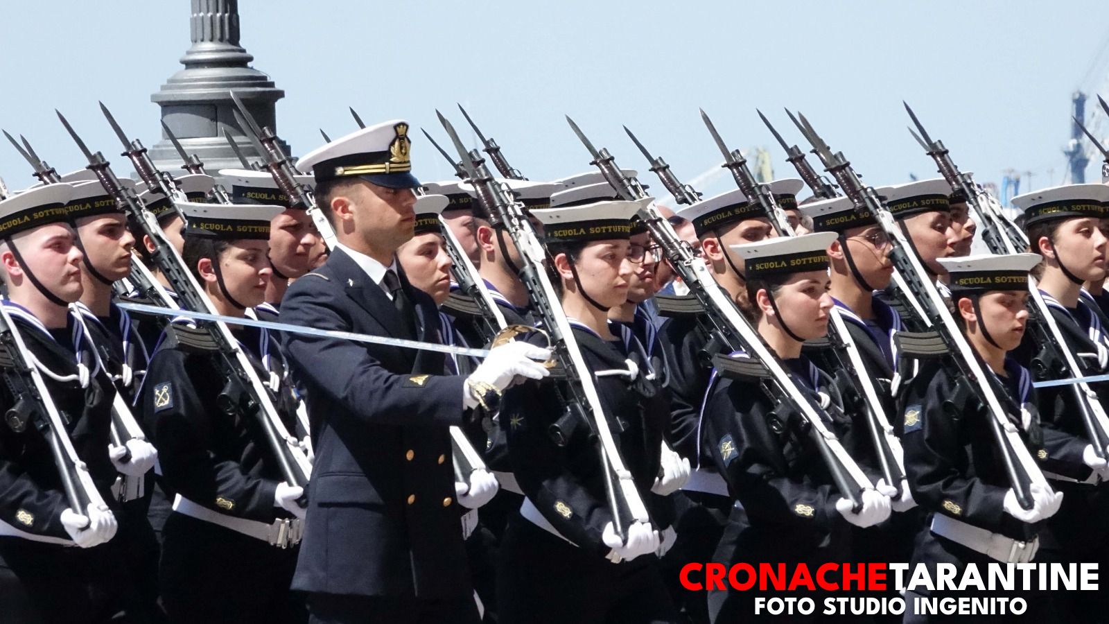 Lo scenario era quello delle grandi occasioni: la Rotonda illuminata dai colori inconfondibili del mare di Taranto, le famiglie assiepate lungo le transenne, gli applausi, gli sguardi lucidi, l’orgoglio trattenuto a fatica. Sullo sfondo, nella rada di Mar Grande, alcune unità navali alla fonda a ricordare la destinazione futura di molti di quei giovani. E poi il cielo: due elicotteri hanno sorvolato la cerimonia, uno con la bandiera della Marina Militare, l’altro con quella della città di Taranto, in un abbraccio simbolico tra la Forza Armata e la comunità che da ottant’anni ospita la Scuola Sottufficiali.