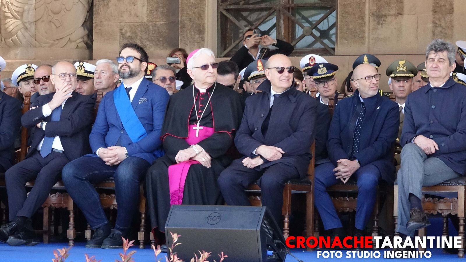 Sulla Rotonda Marinai d’Italia del Lungomare, in una giornata baciata dal sole — venerdì 24 aprile — si è celebrata la cerimonia del giuramento solenne degli allievi marescialli del XXVIII Corso Normali Marescialli e del corso Hercules dei Volontari in Ferma Iniziale, alla presenza del Capo di Stato Maggiore della Marina Militare, ammiraglio di squadra Giuseppe Berutti Bergotto, e del comandante della Scuola Sottufficiali di Taranto, contrammiraglio Giorgio Gentile. Accanto a loro, le autorità civili — il sindaco Piero Bitetti, il presidente della Provincia Gianfranco Palmisano, il vicepresidente del Consiglio regionale Renato Perrini, il senatore Mario Turco — e quelle militari, con i comandanti provinciali di Carabinieri e Guardia di Finanza, il questore e il prefetto. A suggellare la solennità, la presenza dell’arcivescovo Ciro Miniero.