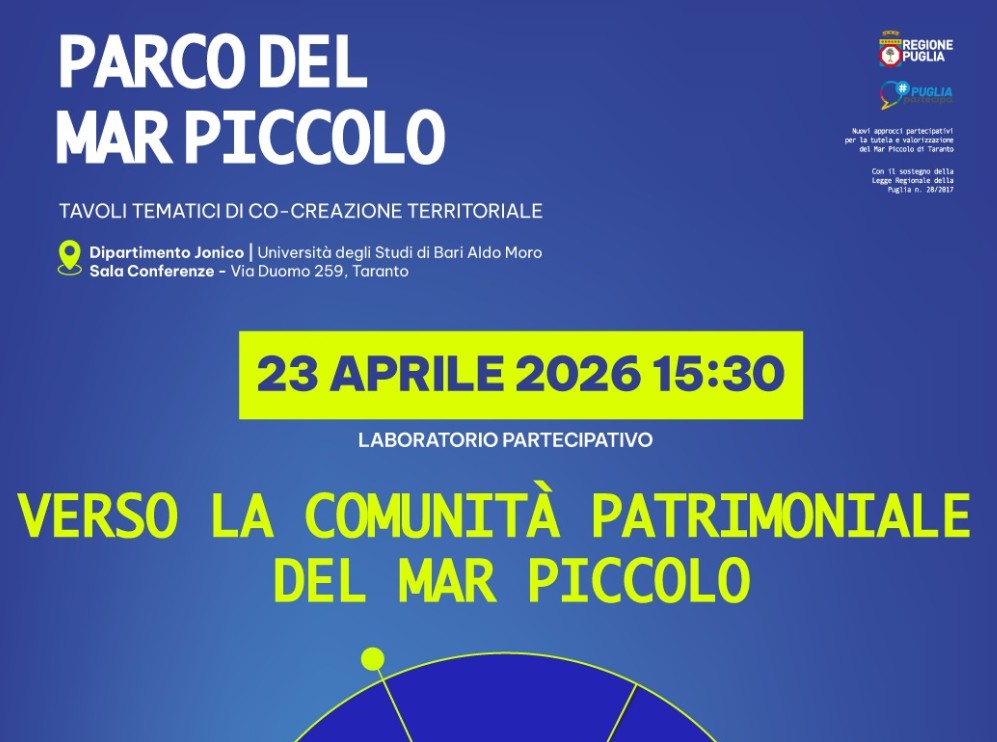 Il percorso partecipativo “Nuovi approcci partecipativi per la tutela e valorizzazione del Mar Piccolo di Taranto”, promosso nell’ambito del programma regionale #PugliaPartecipa ai sensi della L.R. 28/2017, prosegue con il quarto laboratorio pubblico, in programma giovedì 23 aprile 2026, nella Sala Conferenze del Dipartimento Jonico dell’Università degli Studi di Bari Aldo Moro, in Via Duomo 259, a Taranto.