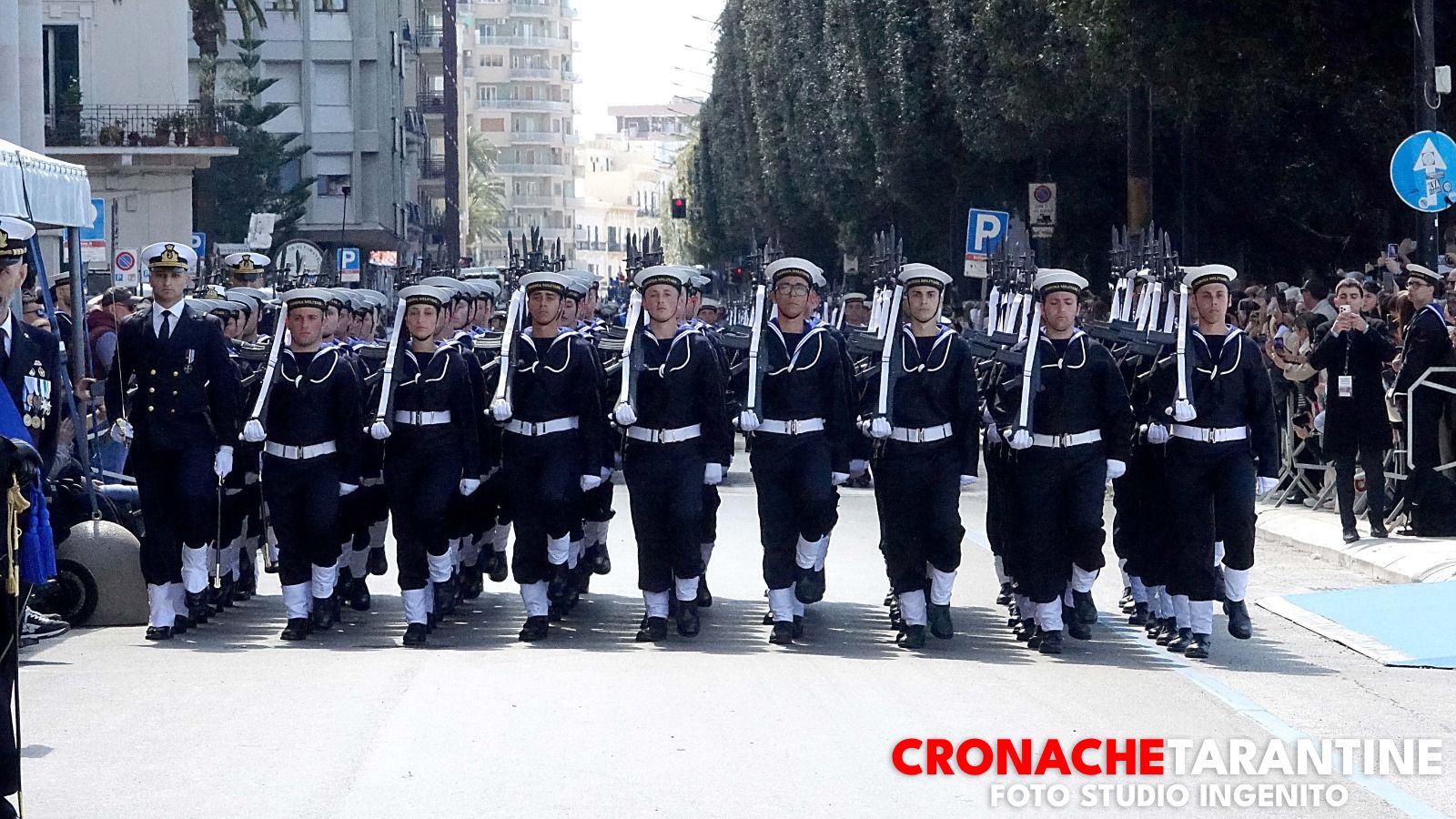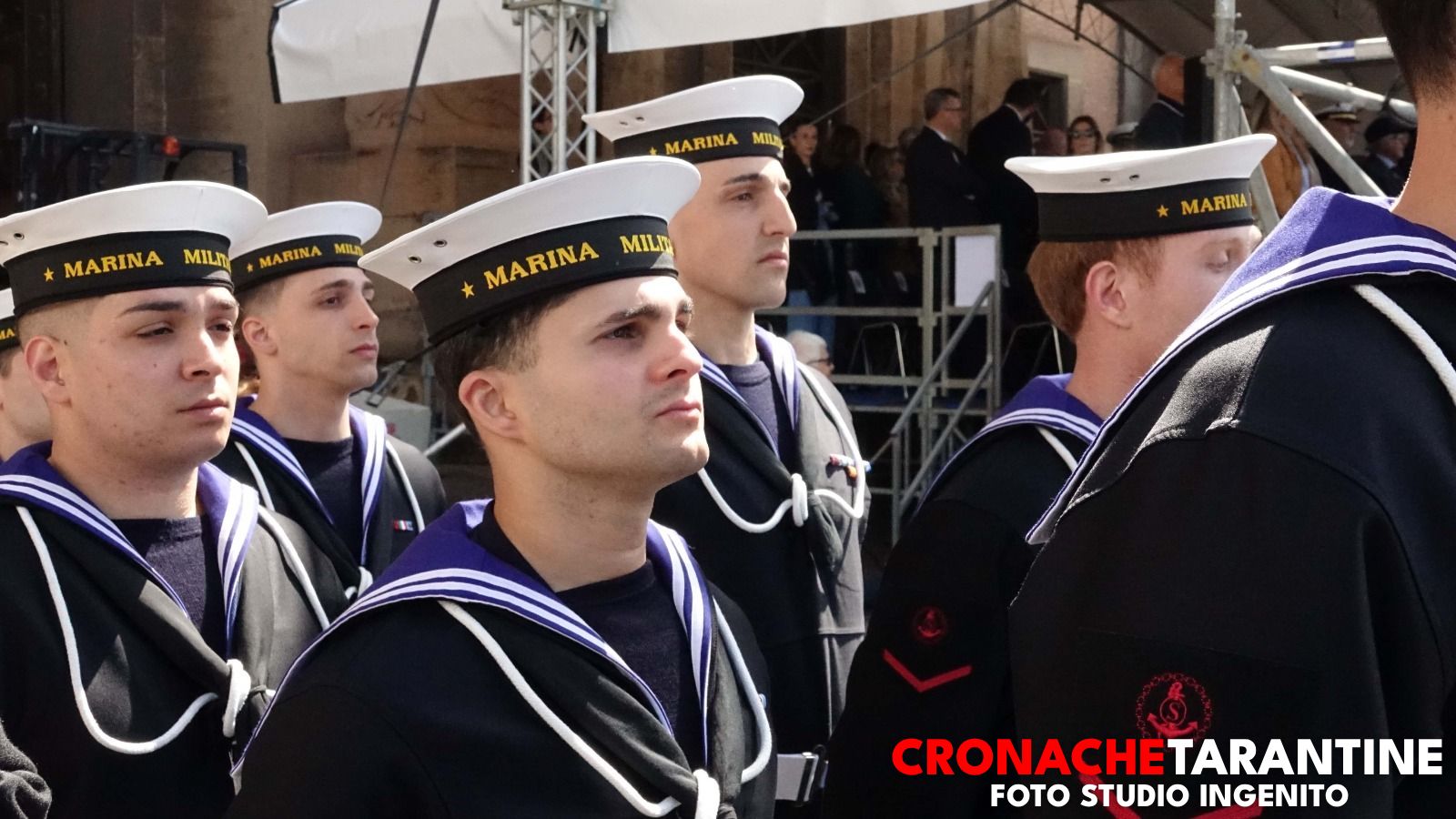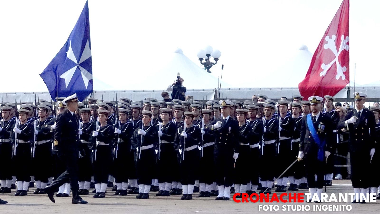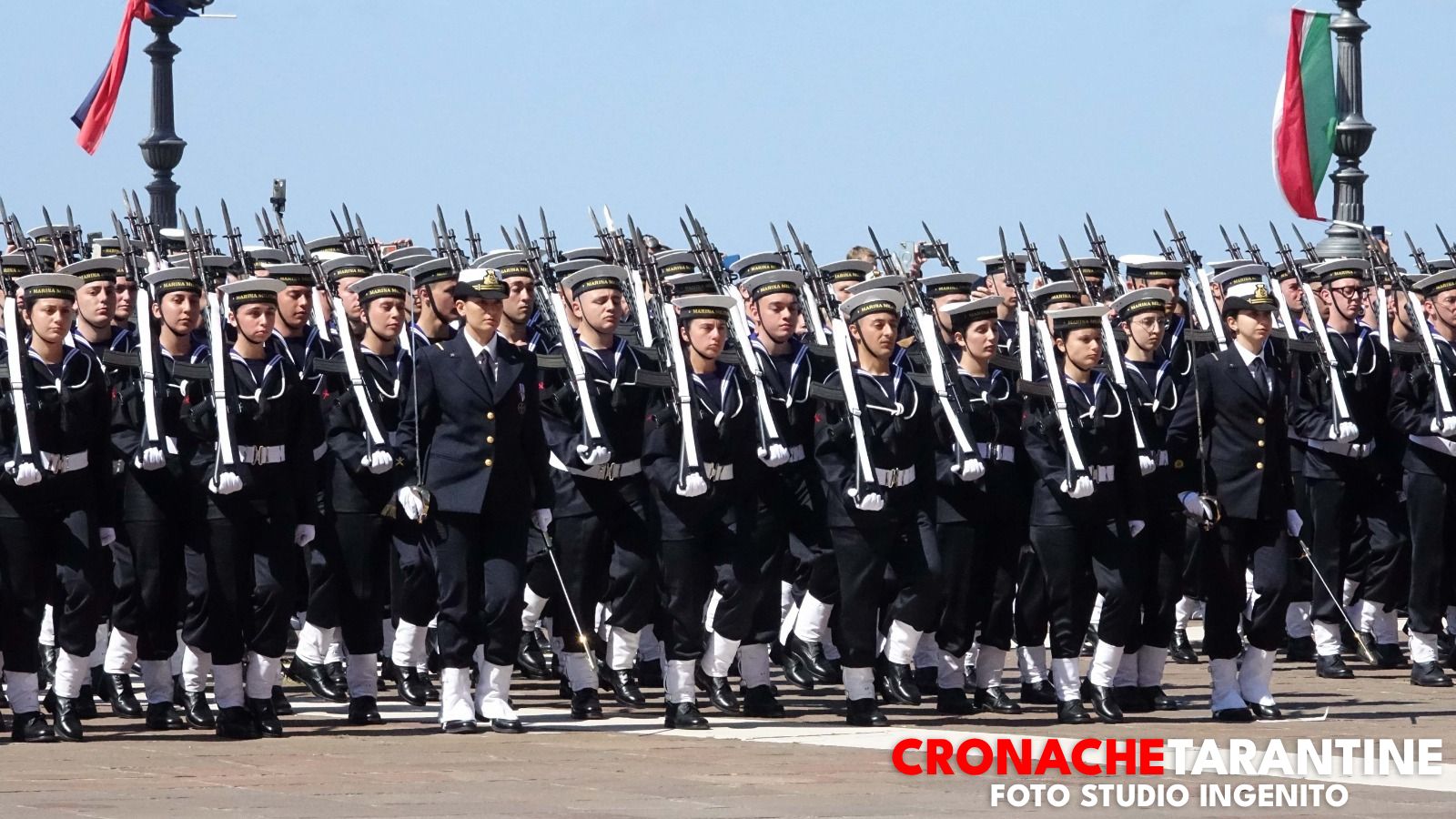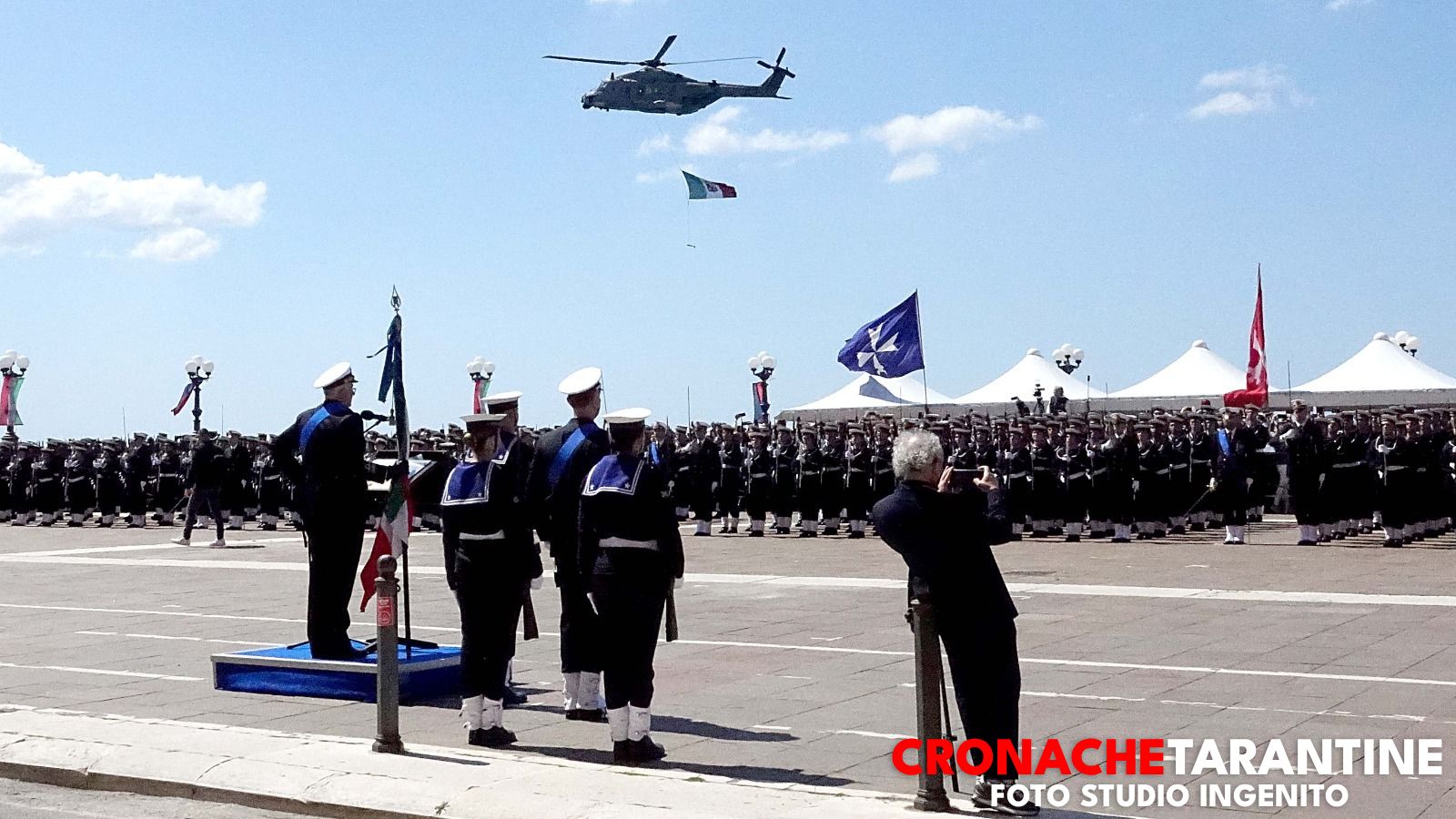 Lo scenario era quello delle grandi occasioni: la Rotonda illuminata dai colori inconfondibili del mare di Taranto, le famiglie assiepate lungo le transenne, gli applausi, gli sguardi lucidi, l’orgoglio trattenuto a fatica. Sullo sfondo, nella rada di Mar Grande, alcune unità navali alla fonda a ricordare la destinazione futura di molti di quei giovani. E poi il cielo: due elicotteri hanno sorvolato la cerimonia, uno con la bandiera della Marina Militare, l’altro con quella della città di Taranto, in un abbraccio simbolico tra la Forza Armata e la comunità che da ottant’anni ospita la Scuola Sottufficiali.