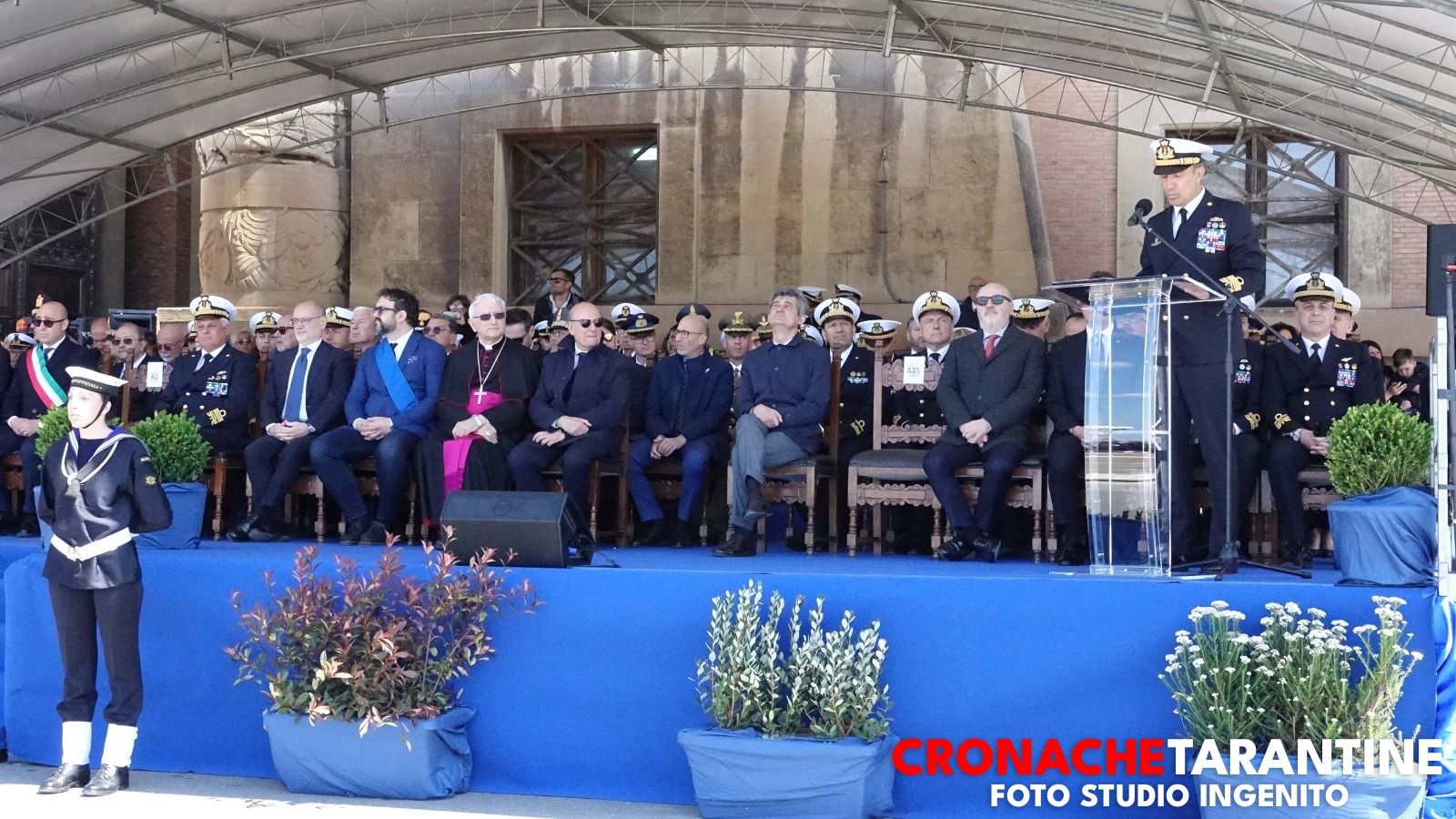 Sulla Rotonda Marinai d’Italia del Lungomare, in una giornata baciata dal sole — venerdì 24 aprile — si è celebrata la cerimonia del giuramento solenne degli allievi marescialli del XXVIII Corso Normali Marescialli e del corso Hercules dei Volontari in Ferma Iniziale, alla presenza del Capo di Stato Maggiore della Marina Militare, ammiraglio di squadra Giuseppe Berutti Bergotto, e del comandante della Scuola Sottufficiali di Taranto, contrammiraglio Giorgio Gentile. Accanto a loro, le autorità civili — il sindaco Piero Bitetti, il presidente della Provincia Gianfranco Palmisano, il vicepresidente del Consiglio regionale Renato Perrini, il senatore Mario Turco — e quelle militari, con i comandanti provinciali di Carabinieri e Guardia di Finanza, il questore e il prefetto. A suggellare la solennità, la presenza dell’arcivescovo Ciro Miniero.