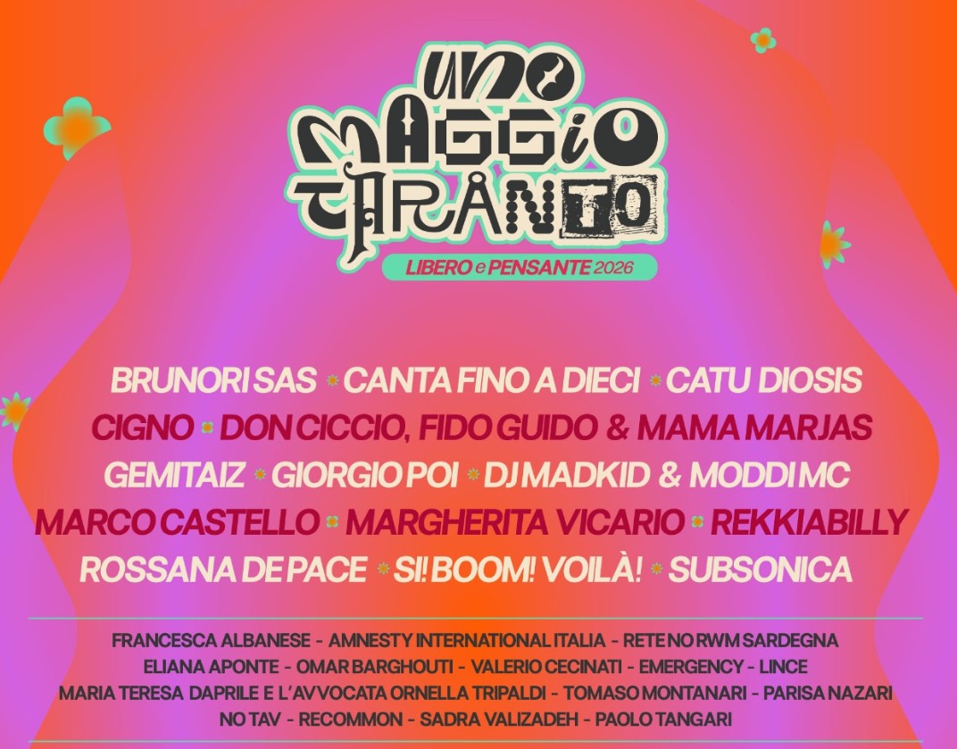 Il Comitato Liberi e Pensanti porterà sul palco i temi del lavoro, dei diritti e della sicurezza, annunciando la presenza di Maria Teresa Daprile, vedova dell’operaio Ilva Claudio Salamida, morto in fabbrica il 12 gennaio, accompagnata dall’avvocata Ornella Tripaldi. Ci saranno Amnesty International Italia, ReCommon, Rete No RWM Sardegna, Emergency, No TAV, l’art researcher iraniana Sadra Valizadeh e l’attivista Parisa Nazari del movimento “Donna, vita, libertà”. L’apertura sarà affidata alle immagini della fotoreporter cubana Eliana Aponte (Reuters) e di Paolo Tangari, appena rientrato da Cuba. Sul palco anche il dottor Valerio Cecinati, fondatore dell’Oncoematologia Pediatrica del SS. Annunziata, per ricordare il legame drammatico tra inquinamento e salute. E ci sarà l’attivista Lince con la campagna “Lince – Occhi sugli abusi”, accompagnata dal manifesto di Zerocalcare.